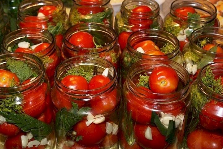 Помідори двічі заливають окропом, а потім маринадом з оцтом. Це швидше і зберігає смак.